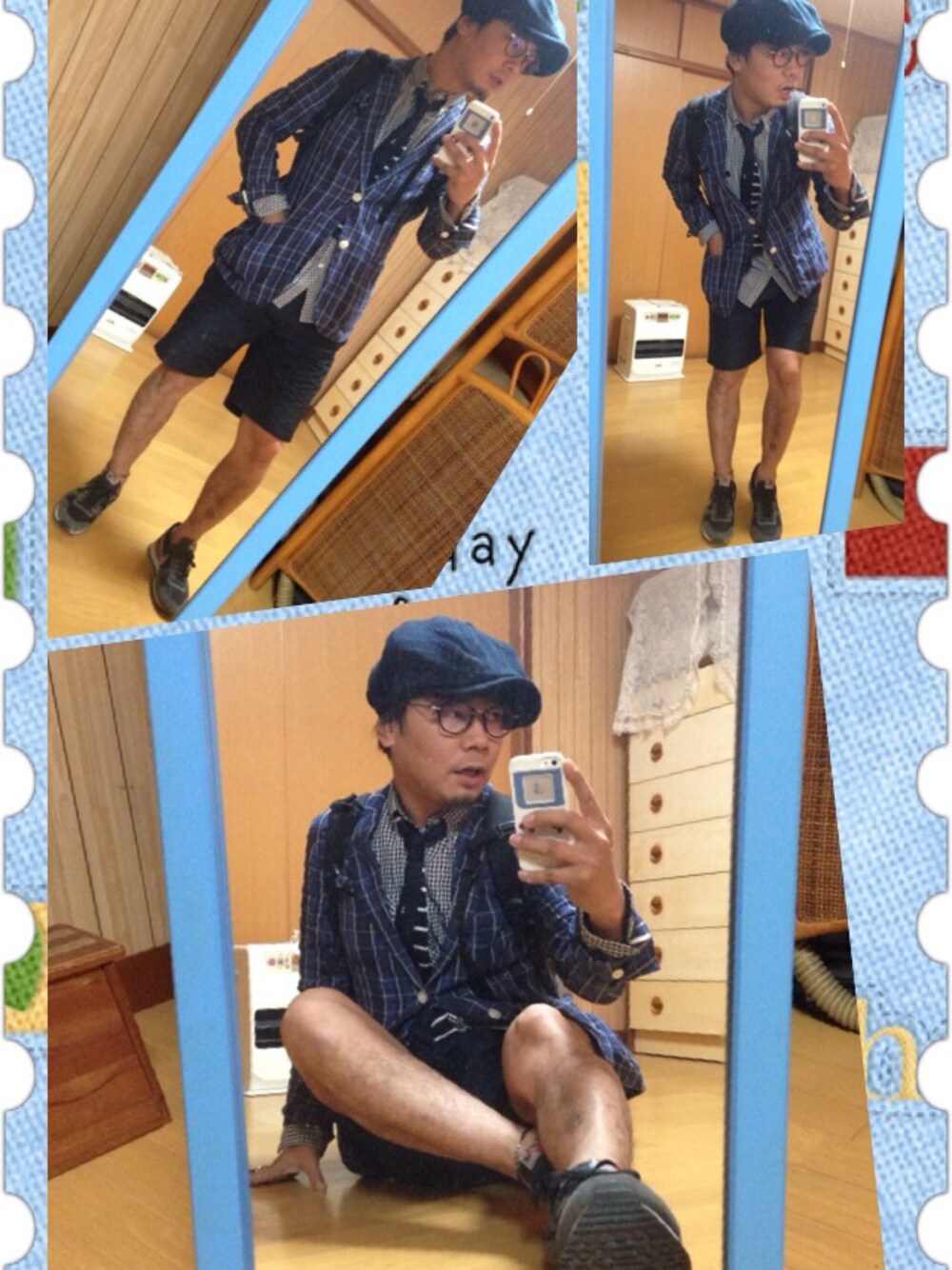 ショーツ&ジャケットで、昨日のジャケの着回し^_−☆インナーはギンガムチェックシャツに、ニットタイ。