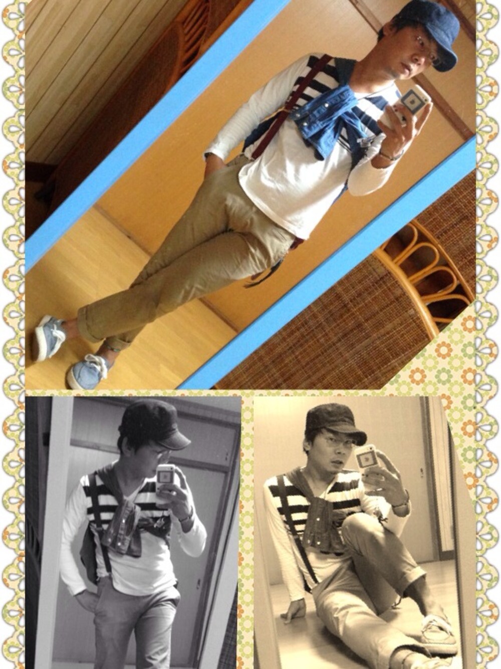 天気も良いので、 ボーダーまりんのスタイリング。 付属でデニムシャツを肩巻き、 サスペンダー^_−☆ デッキシューズと、キャップは、 GU。 さて、今日も仕事がんばろー! いつもフォロー&SAVEありがとうございます^_−☆