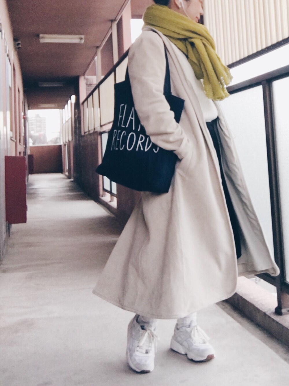 ベージュ系のその他アウター、ホワイト系のスニーカーを着用したレディースの冬コーディネートの1枚目の写真