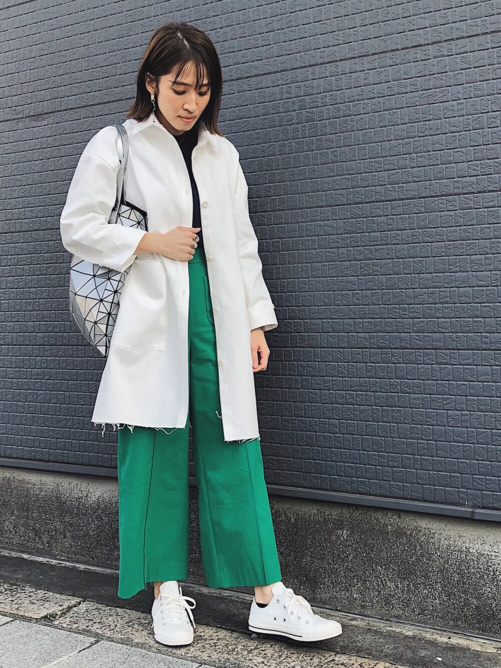 ホワイトとグリーンでまとめたコーディネート。 オーバーサイズのデニムジャケットが メンズっぽくて可愛い。 切りっぱなしになってて カジュアル感もでて可愛い。