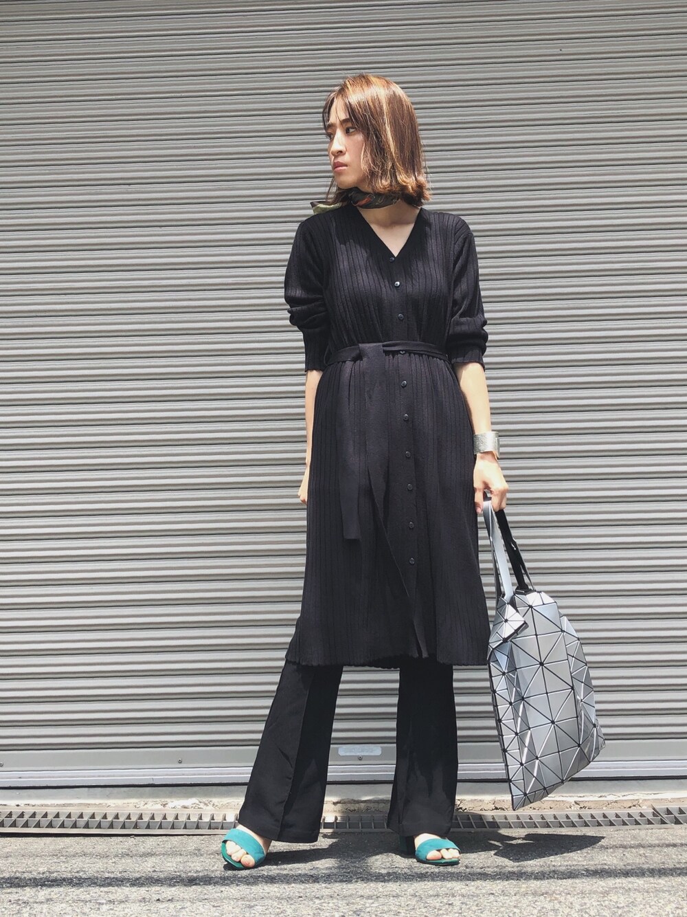 カーデガンのボタンを全部閉めて 黒のフレアパンツとあわせて なんちゃってセットアップ風。 これだけだと寂しいから カバンをアクセント。 首元にもガラスカーフ。 ただ暑い😵