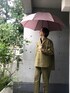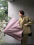 グリーン系のジャケット/アウター、ブラウン系の長傘を着用したレディースの秋コーディネートの2枚目の写真