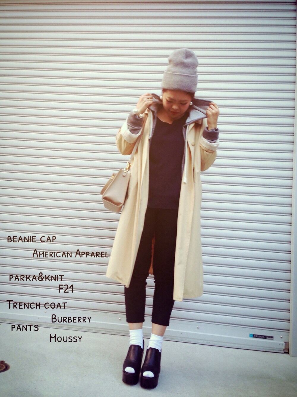 Beanie : AmericanApparel Trench : Burberry Parka : F21 Knit : F21 Pants : Moussy Shoes :韓国 Bag : 韓国 久々に寒い〜☃☃☃
