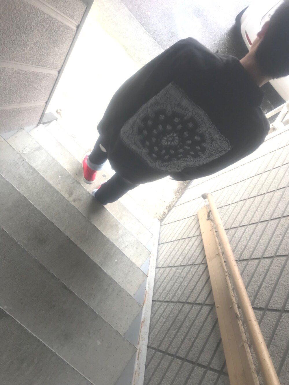 上は、黒系統でシンプルに、 スニーカーは、赤でアクセントをプラス