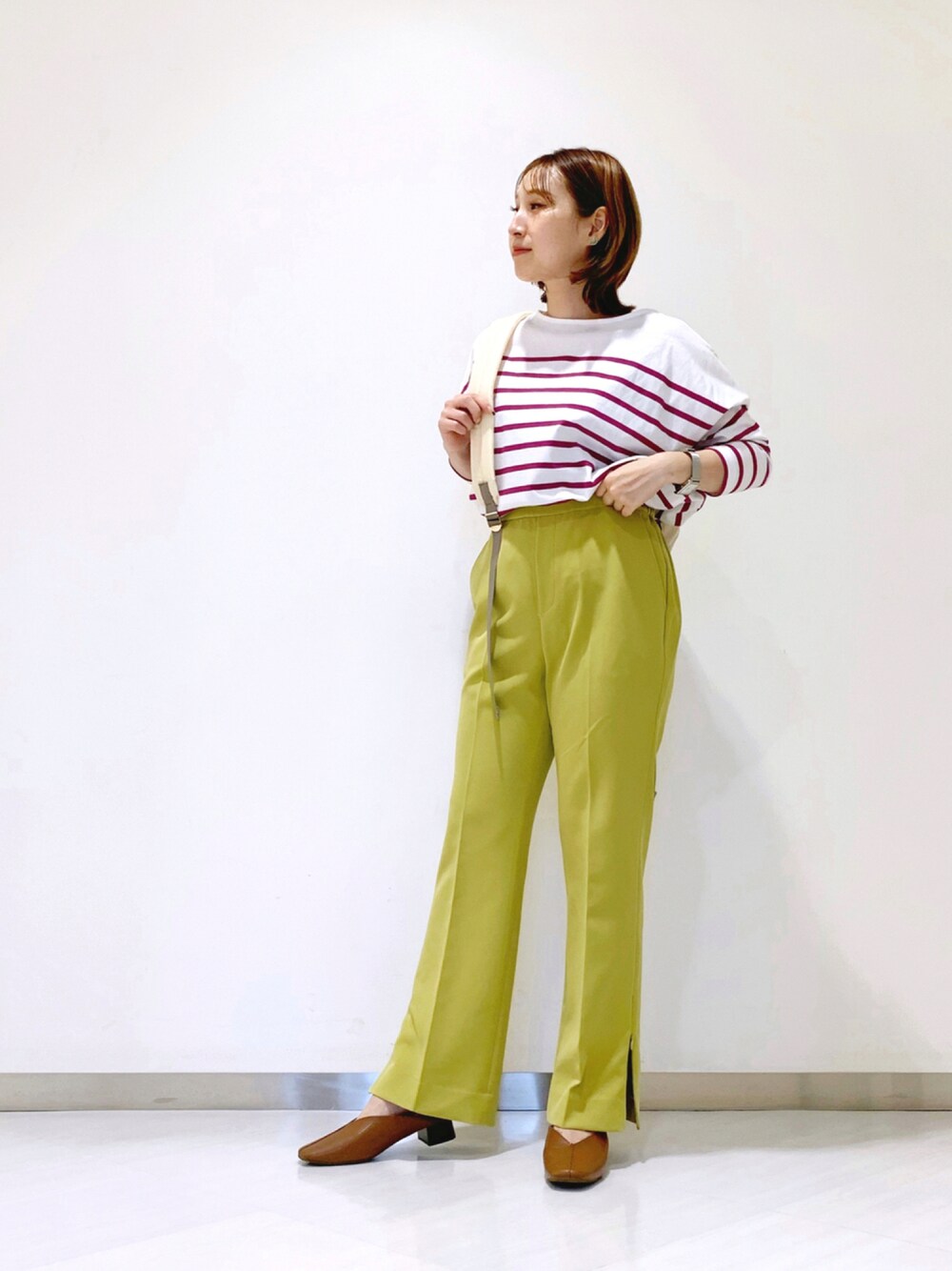 イエローが目を惹くパンツに負けない、ピンクのボーダートップスを合わせたカラーミックスなスタイリングです。 カラー×カラーの組み合わせは一見上級者ですが、ボーダーで取り入れることで軽やかな馴染みの良い印象になります♪