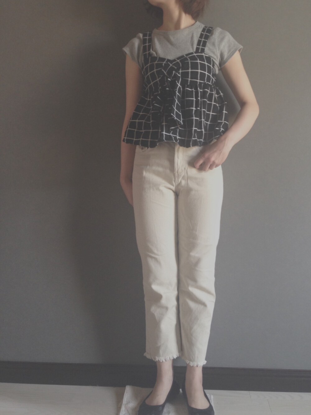UNIQLOグレーのリブTにしまむらのトップスを合わせました🌸 元々、しまむらのは白Tがセットになっていたので着回し抜群です🙋 バレエシューズはやっぱめちゃめちゃ使える😆💗 見てくださり、ありがとうございます👼✨