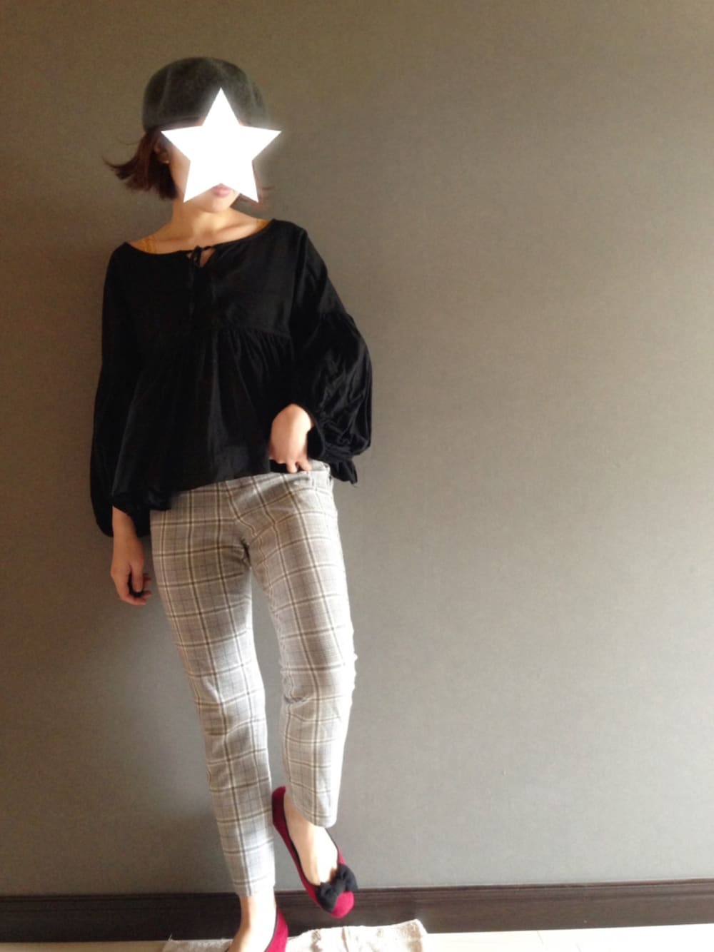 パンプスを差し色に。 大好きなボリューム袖やチェック柄やベレー帽を散りばめて🌿 見ていただき、ありがとうございます😊💕