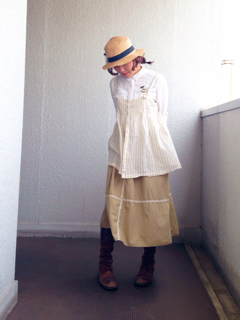 アメ村にできたアリスSHOPに行きました* でもこの日は赤毛のアンをイメージしたコーデ。。。 麦わら帽子/3coins 白シャツ/gu エプロンみたいなやつ?/古着 スカート/古着 ブーツ/だいぶ前に買ったやつ