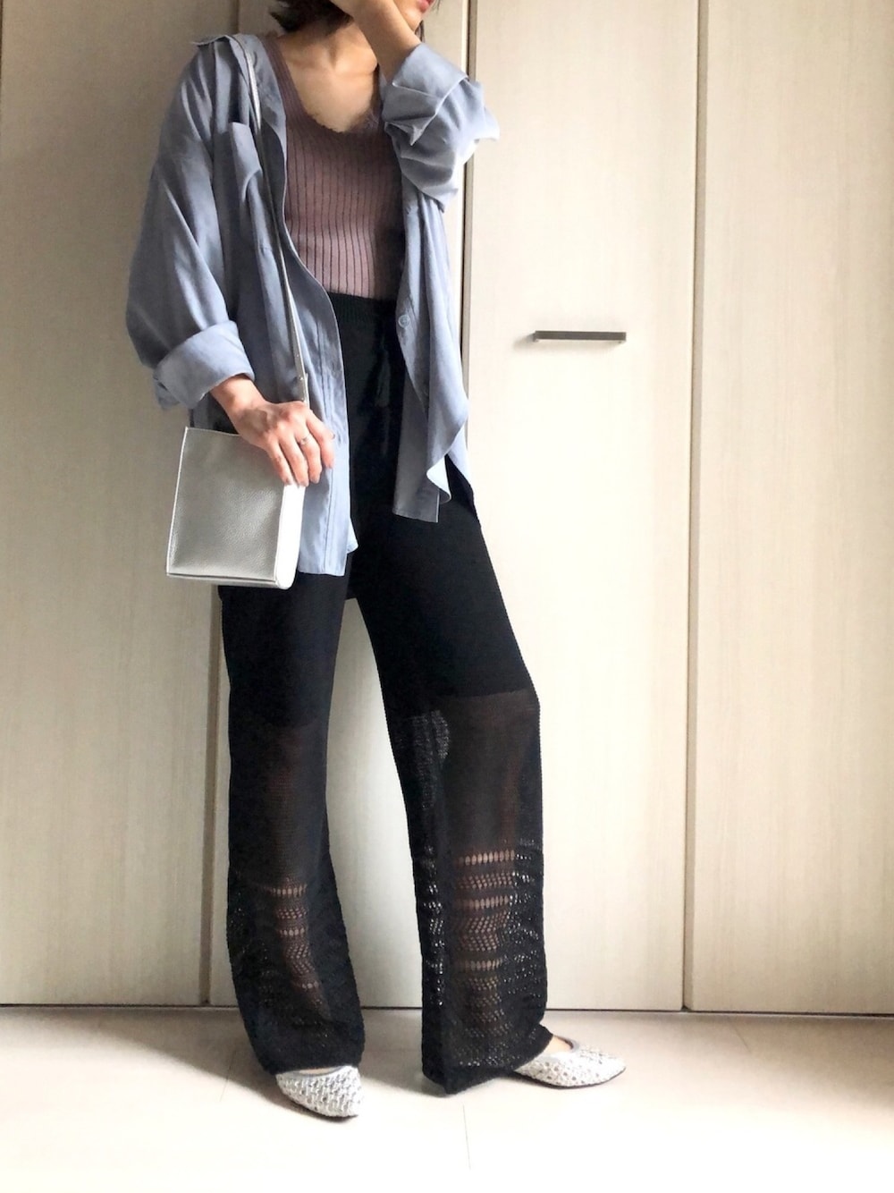 お昼間は天気が良くポカポカした日が多いので、シャツにニットのタンクトップが楽なのにお洒落感あり ☀︎ ボトムはレース編みニットのパンツで今年らしく ☺︎