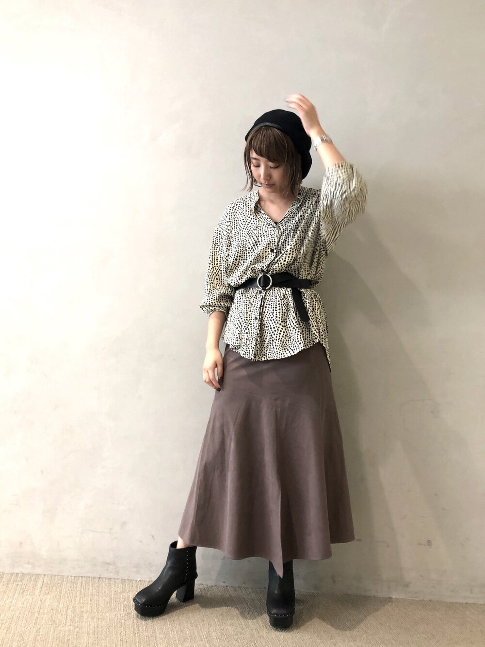 ブラウンが重たくなりすぎないようにシャツをアウトにしてベルトをする事で、バランスの良いコーデにしました。 シャツは、あまり柄シャツ(特にアニマル柄)は着ない私でも着やすいです! スカートは、マーメイド且つしっかりしたスエード生地なので形が綺麗です◎