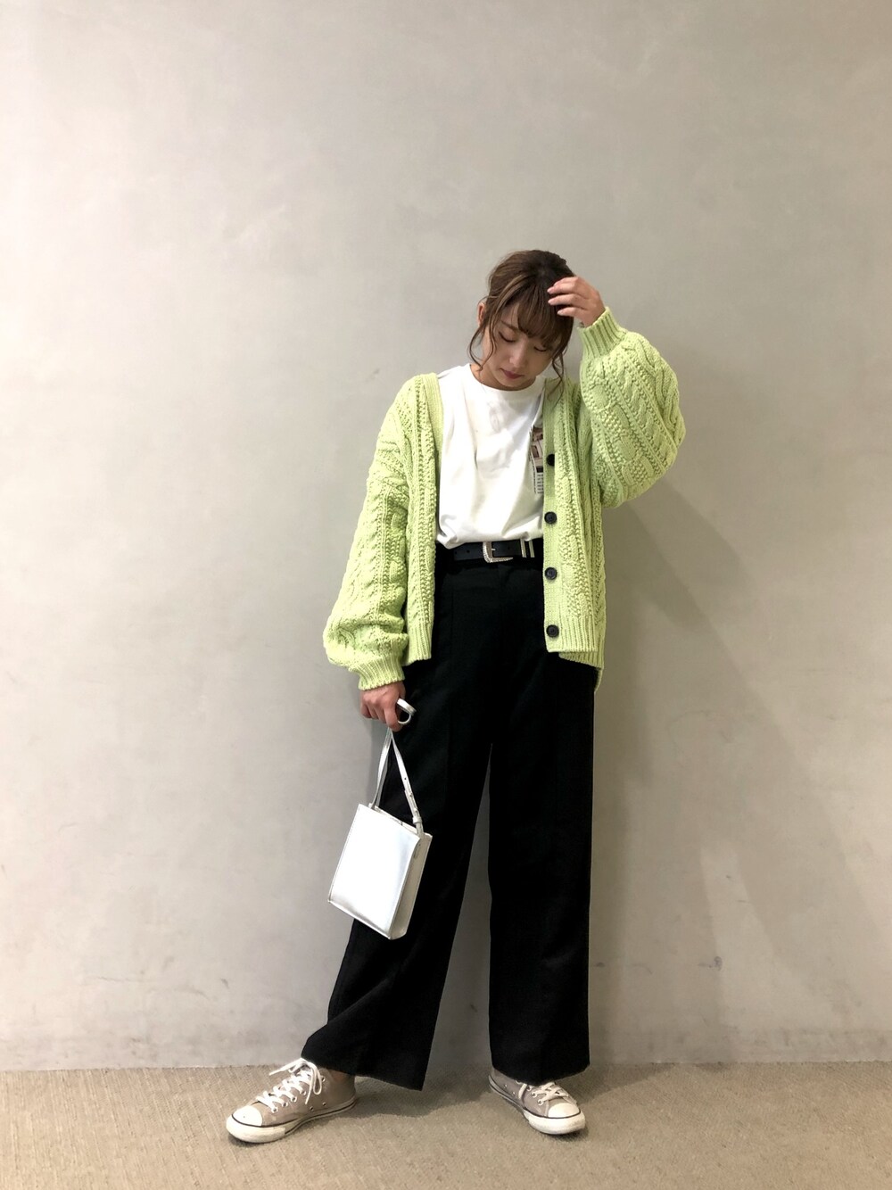 ゆるっとしたカーデ×Tシャツ×ストレートパンツの楽ちんコーデです。 カーデが長めでかなりゆったりめなので、スッキリしたパンツがバランス◎ ライムの色に黒を合わせることで春っぽくならず着ていただけます!