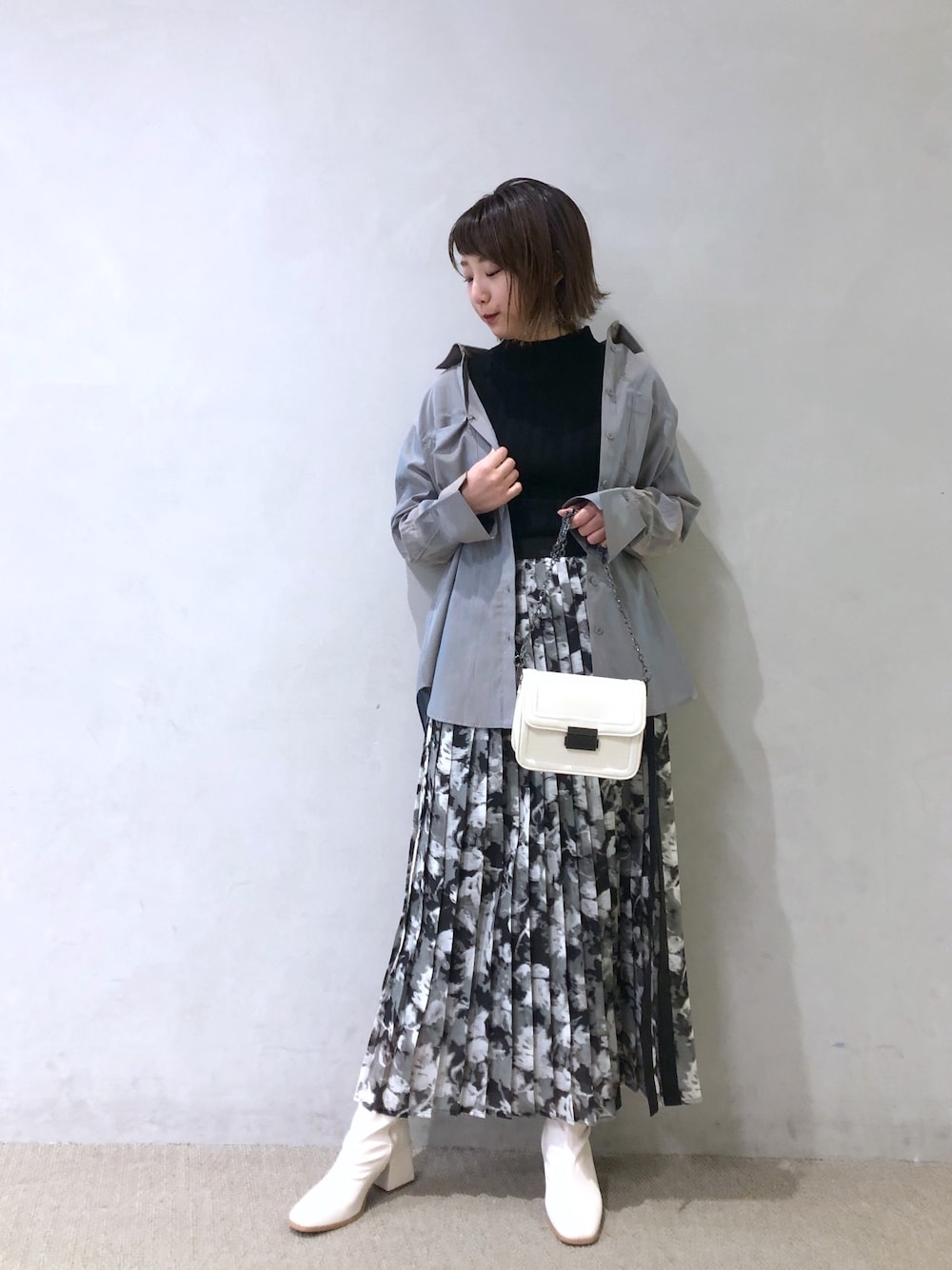 落ち着いたトーンの春コーデです。 トップスやスカートはブラックを中心に、小物は白でまとめて明るい印象に。 モノトーンに見えてシャツはオリーブなので、より大人っぽい印象になります◎