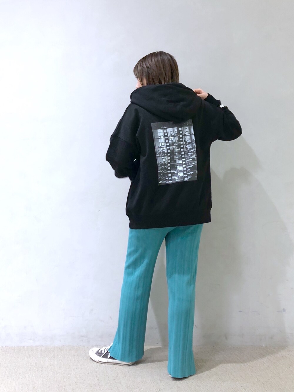 パンツがすっきりとしているので、ユニセックスのパーカーでメリハリのあるコーデに。 パーカーのバックプリントがモノトーンなので、カラーパンツのパキッとした色が映えます!