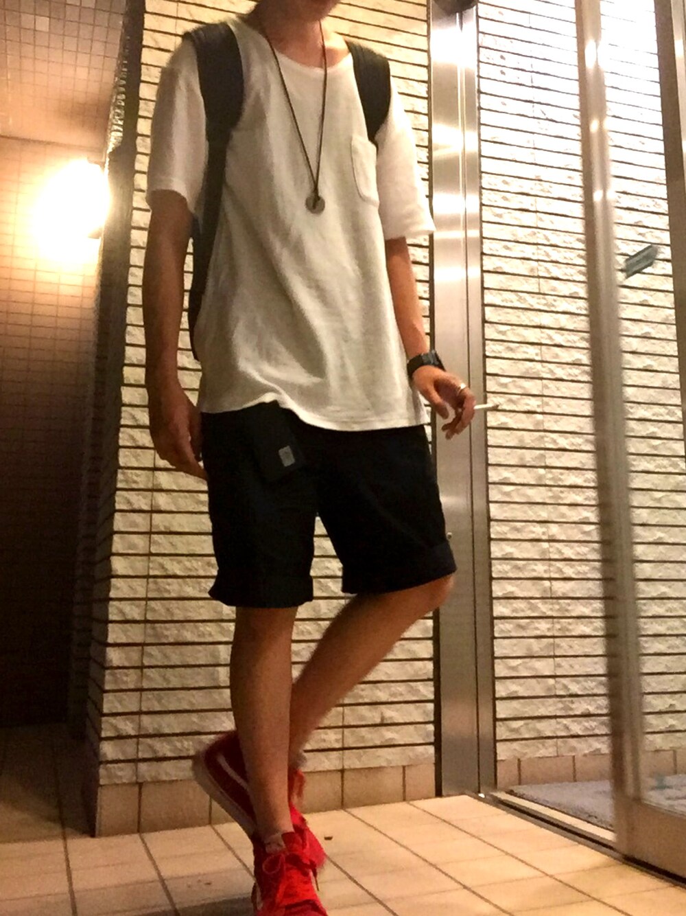 2016.08 ビックシルエットTに 細めのハーフパンツを合わせて シンプルに。 赤いスニーカーでポイントを。 夏も終わりですね〜