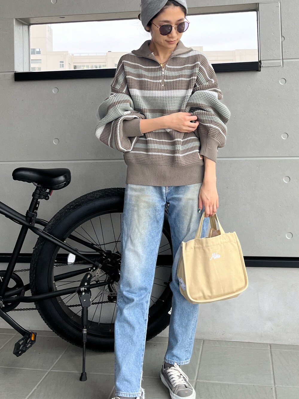 まちょのニット/セーター「《JaVaジャバ コラボ》レトロ可愛い。マルチボーダー軽量ワッフルハーフジップオーバーサイズニット」を使ったコーディネート