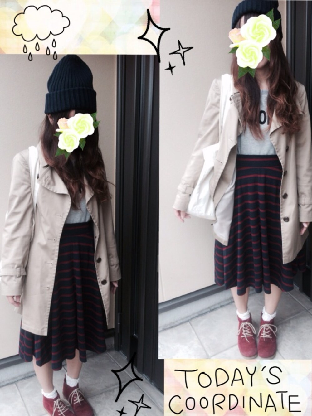 寒くなってきたのでトレンチがかかせないまいにち。。☻ トレンチ◎ノーブランド トップス◎THE EMPORIUM スカート◎THE EMPORIUM 靴◎mare mare ニット帽◎earth music&ecology トートバック◎UNITED ALLOWS