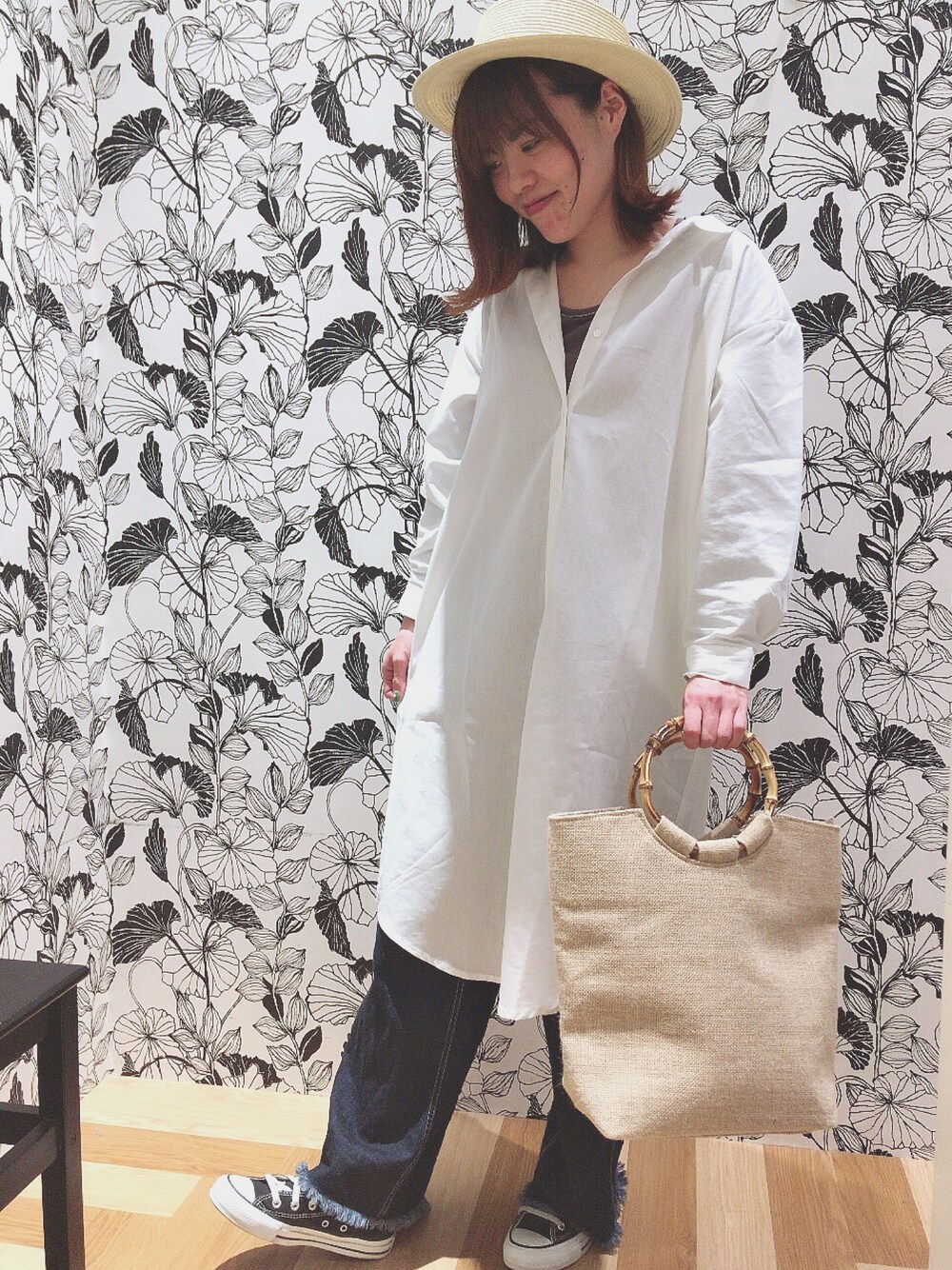 シャツワンピにデニムの爽やかコーデです! 今から大活躍のカンカン帽、バッグもおすすめです★