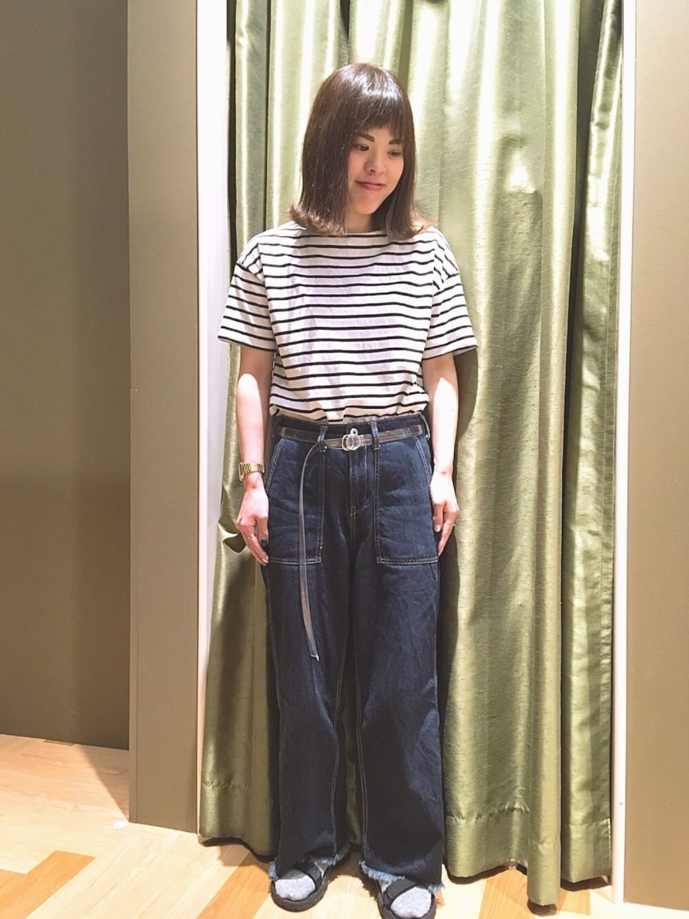 今日は定番のボーダー×デニムワイドパンツ👖 夏を意識✨ 足元はシルバーラメソックスでキラキラ✨ Tevaは今年も大活躍!