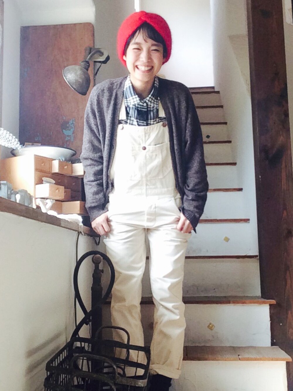 真っ白オーバーオールは、締め色のシャツと羽織で❤️