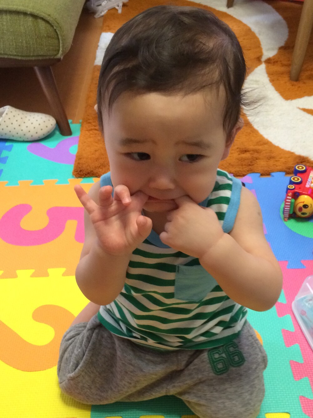 いつかのコーデ(*^^*) UNIQLO率高いな〜w 近所にUNIQLOあると ついつい立寄ってしまって 買っちゃう。。 息子くん。 最近指を口に入れてハムハムするのが癖。 歯が生えてくるのかな?