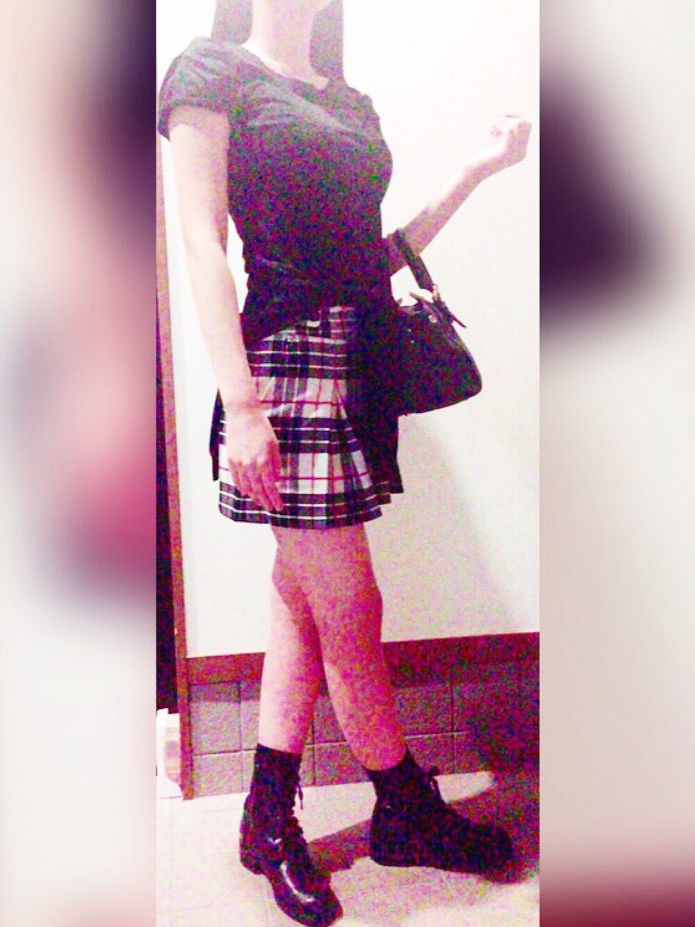 画質悪いけど載せます お気に入りの塊です * 貰い物の限定品Tシャツ スカートぽいけど チェックのショートパンツ カーディガンは腰巻きに 編み上げブーツ ラメの入った黒靴下 *
