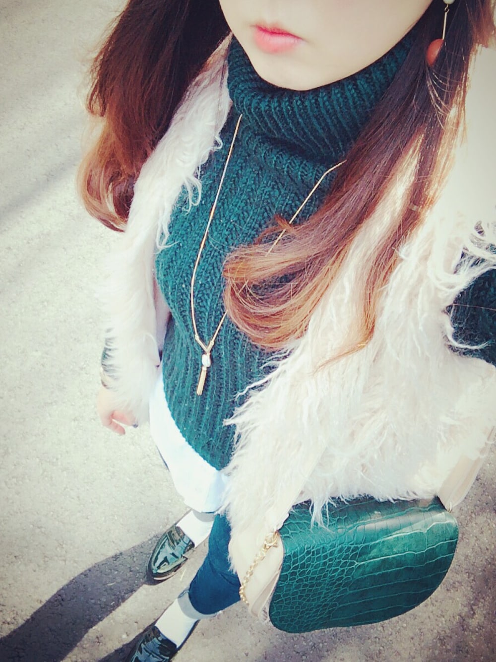今日はずっと見たかったラ・ラ・ランドを観に、日比谷へ👟 ニットもバッグもローファーも全部モスグリーン💚 シュレックですか。😂 おまけにファーベストとレザーのバッグって、またぎですか、狩人ですか、8時ちょうどに旅立つんですか。😂 一個一個は可愛くて好きなんですけどね😂 最近、薬の副作用でおデブちゃんなのでIライン意識してばっかです😭 この間買ったこのネックレスはその点、優秀!!🙏✨