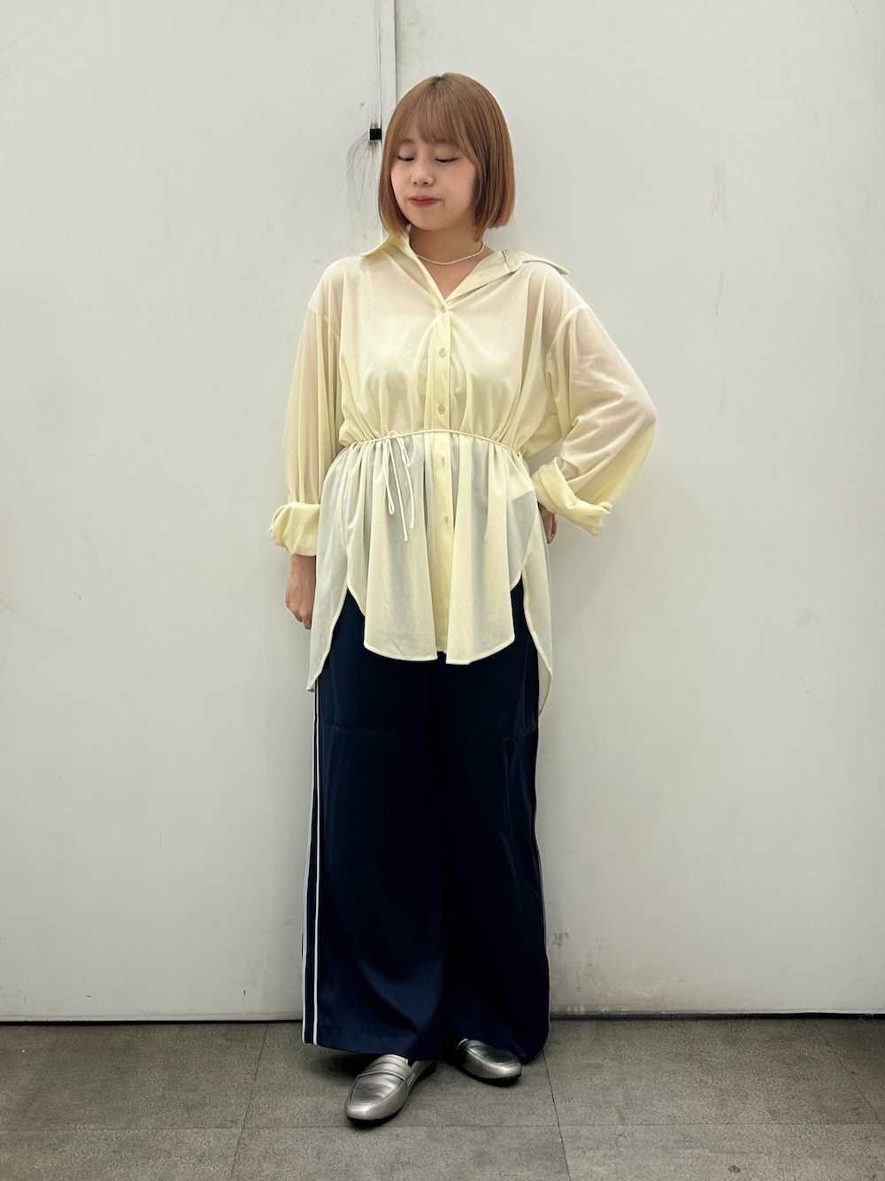 新作のベロアシャツはマルチに使える紐付きで、今回は腰に巻いてウエストマークにしました! 大きめのシャツでもウエストマークすると骨ストさんにも細見えです⭕️ ラインパンツを合わせてカジュアルに合わせました!!
