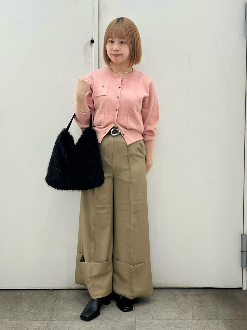 ピンクのニットはポケットとボタンがポイントで可愛いです♡ ボトムスのパンツは裾にかけて広がるデザインで足長効果⭕️