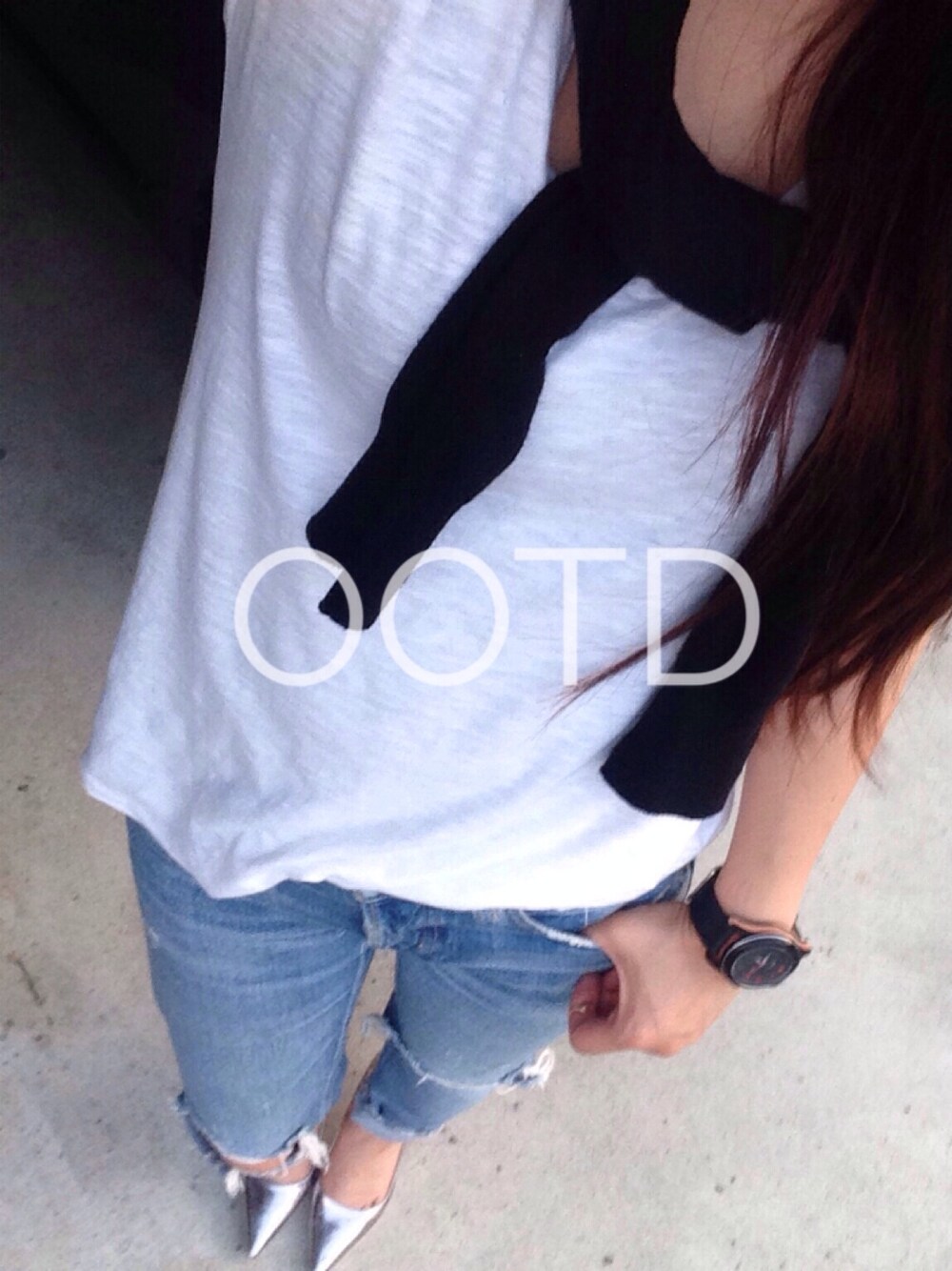 ざ、しんぷる。♡ デニム着回しコーデ☺︎ 黒カーデもmoussy♪ Tシャツは何年か前のZARA♪ 時計はマークバイジェイコブス。 どこかに色物もってこようとしたけど あえてシルバーのメタリックパンプスな気分でした♡