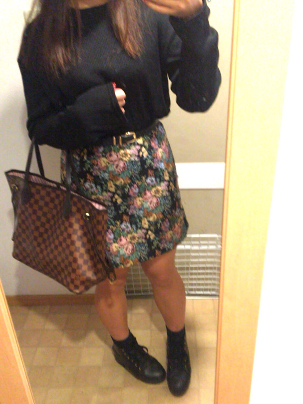 GUのゴブランミニスカートの可愛さと着まわしやすさは最高です。 EMODAの黒ニットはリブが入っていてスッキリします。 袖は裾口がフワッと開いてて萌え袖なります