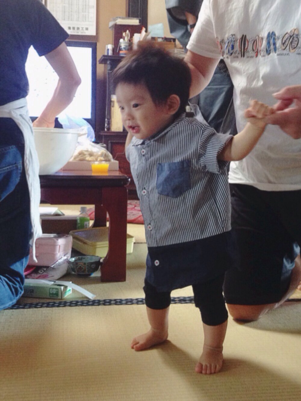 Sサイズはまだ大きかったけど、いめはやりのオーバーサイズかなってことで着てみた〜かわゆい💓💓 おばあちゃんちで、おじちゃんに支えられたくさん歩いてご機嫌。 家でも、こんなふつに手をつかんで、歩こう!!て催促してくるようになりまひた