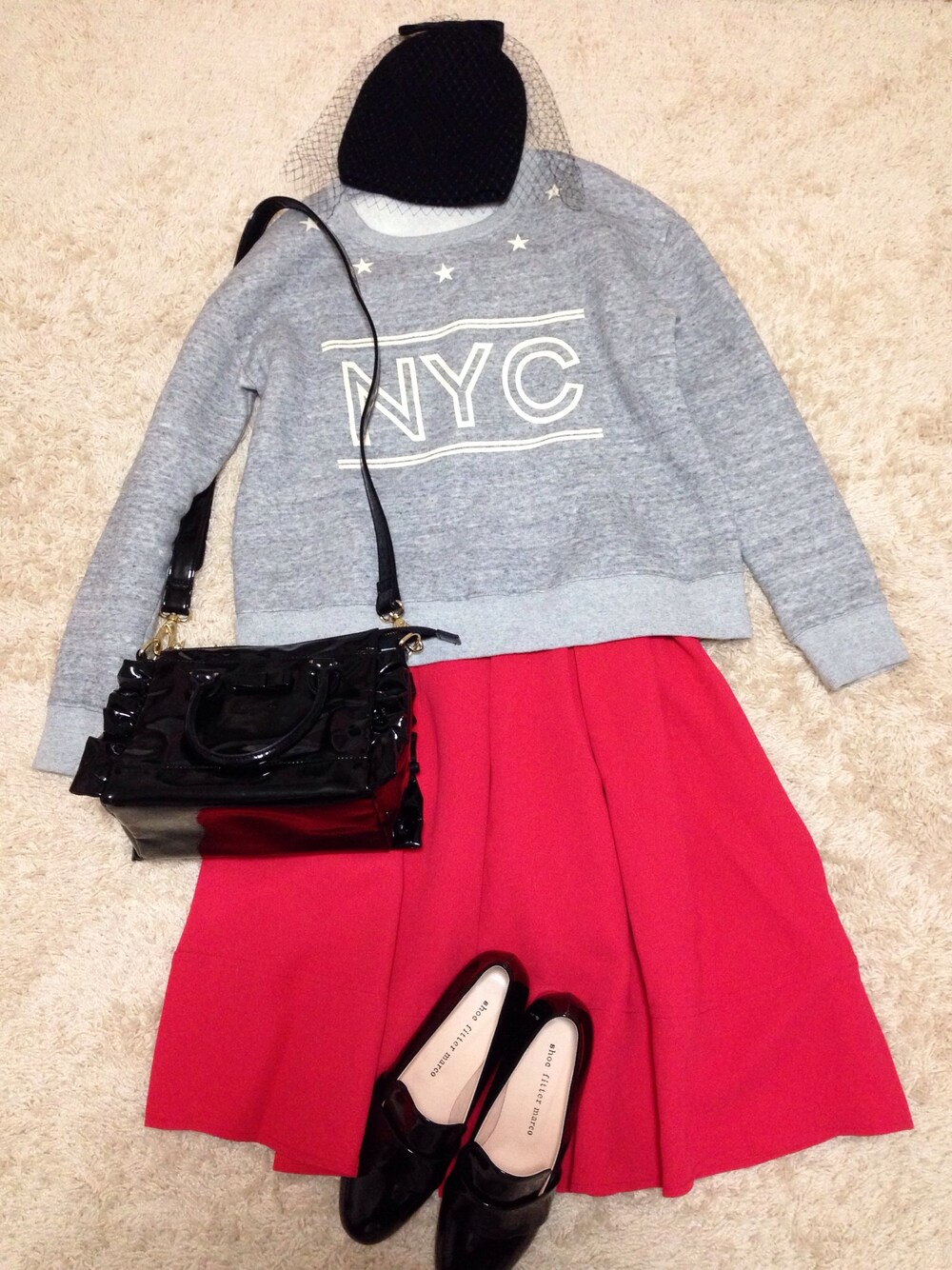 *Holiday トレーナー…LAYMEE スカート…DHOLIC ニット帽…ノーブランド シューズ…DHOLIC バッグ…Labyrinth おNEWな真っ赤なスカートとエナメルのパンプス♡ どっちもDHOLICです! まだGetできてないけれど、ラインソックスを合わせたい(^ω^)