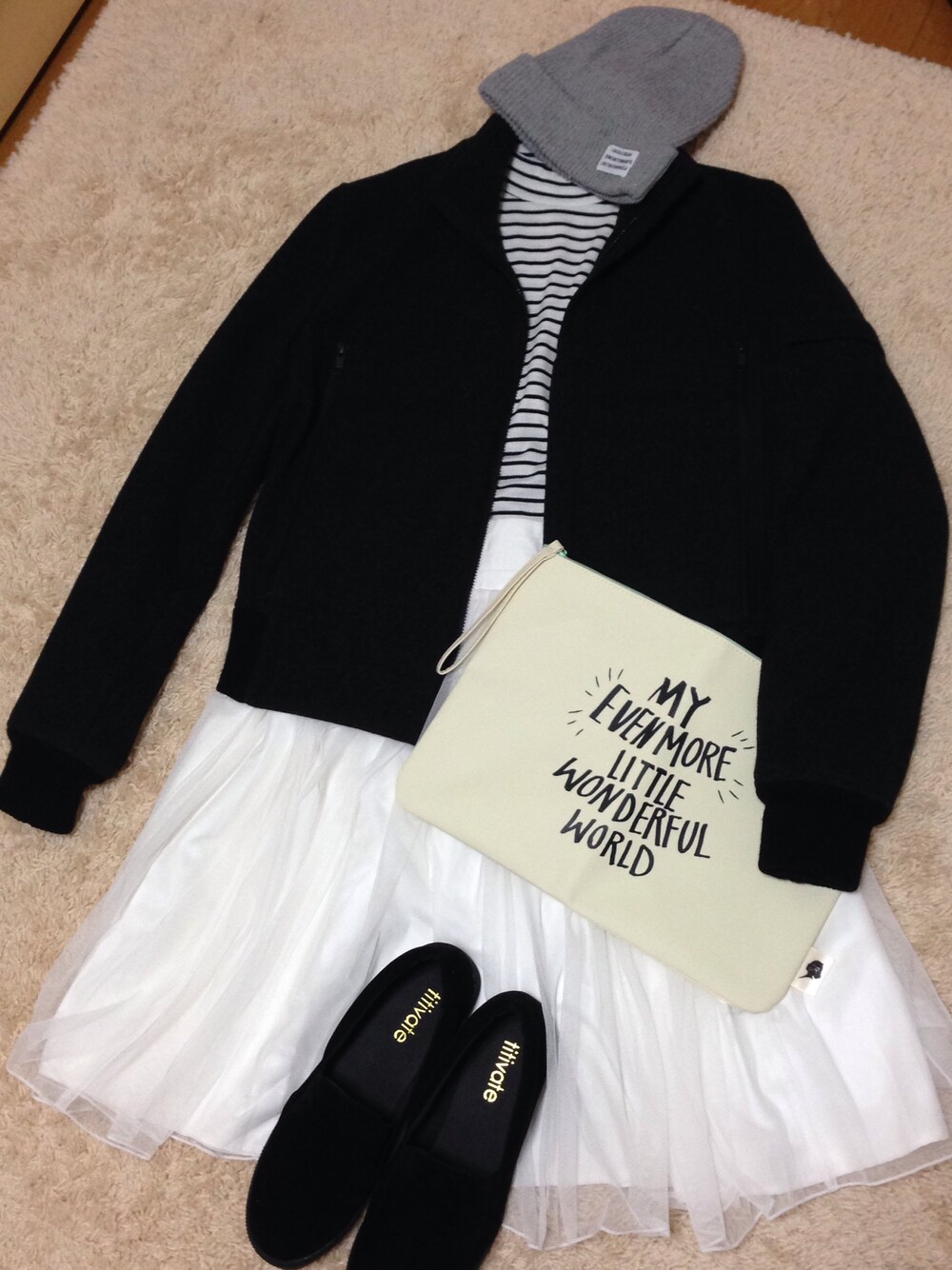 ブルゾン…UNIQLO (古着屋 500円) トップス…LOWRYS FARM (セール 1500円) スカート…LOWRYS FARM (セール 2500円) ニット帽…Nomine x Rina Tanaka (UM付録) クラッチ…casselini x Rina Tanaka (UM付録) スリッポン…titivate (3500円) 洋服はプチプラが好き♡ 雑誌の付録も大活用します\(^o^)/