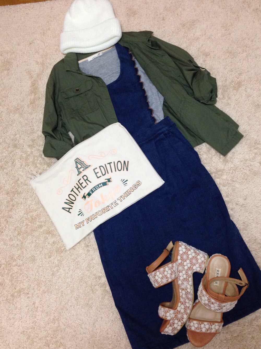 ミニタリージャケット…MAJESTIC LEGON Tシャツ…SEVENDAYS=SUNDAY サロペット…KIKKA THE DIARY OF ニット帽…Labyrinth サンダル…RANDA クラッチ…Another Editionノベルティー 早く春が来ますように…*。