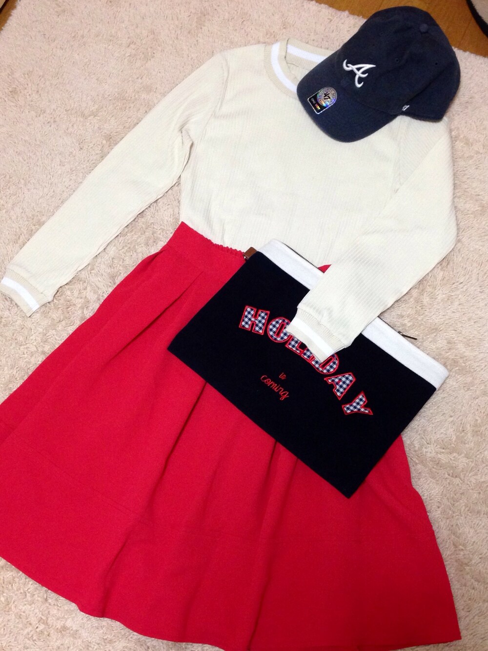 トップス…Nomine スカート…DHOLIC クラッチ…casselini x Rina Tanaka キャップ…ノーブランド おNEWのトップスでコーデを考えました☻ 首元と手首のラインがお気に入り! 足元はスニーカー履きたいです♪
