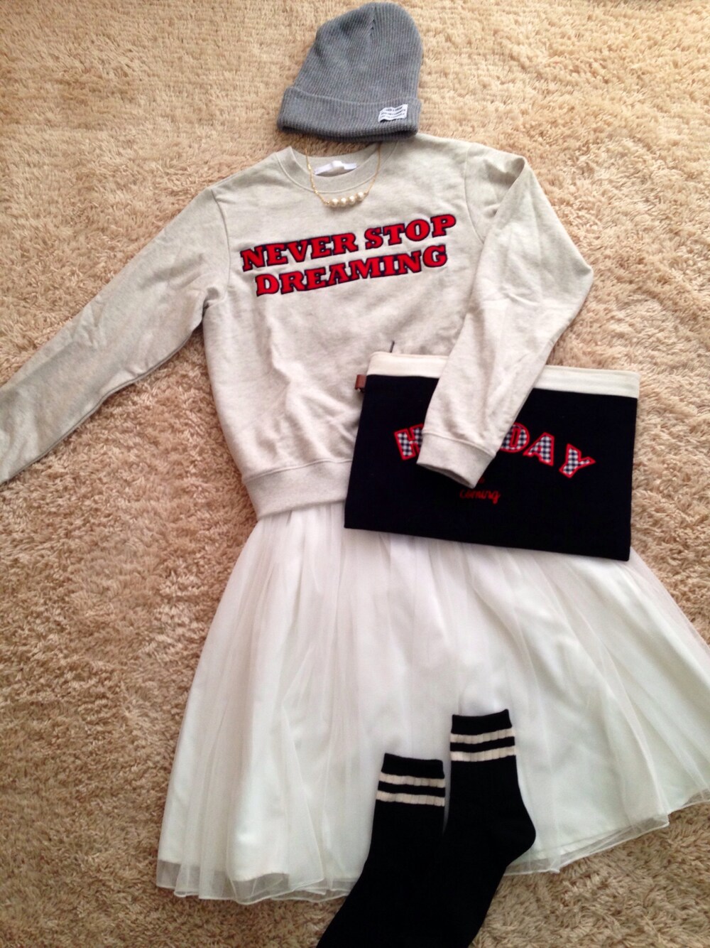 スウェット…thpry+color スカート…LOWRYS FARM バッグ…casselini x Rina Tanaka ニット帽…Nomine x Rina Tanaka ソックス…LEPSIM オールホワイトな春コーデ*。