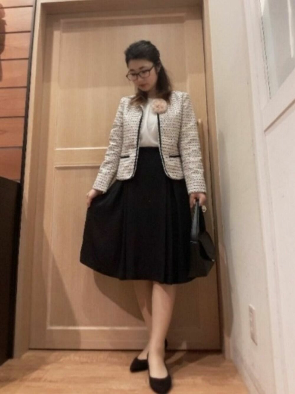 ご覧頂きありがとうございます😃 いいね♥️やフォロー嬉しいです😺🎵 セレモニースタイルです💡ツイードジャケットとコサージュをピンクにし、ふんわりスカートを合わせてフェミニンにコーデしました(*´∇`)ノ ブラウスとスカートはお家でお手入れ可能💡 ブラウスは、首元のパールが取り外せる2wayです💡ネックレスしない派の方も首元華やかになりますょ゚+。:.゚(*゚Д゚*)゚.:。+゚ bagは、フロントのゴールトのパーツが可動式なので冠婚葬祭で使えます💡 小窓にジャケットのアレンジver.も…(*´∀`*)
