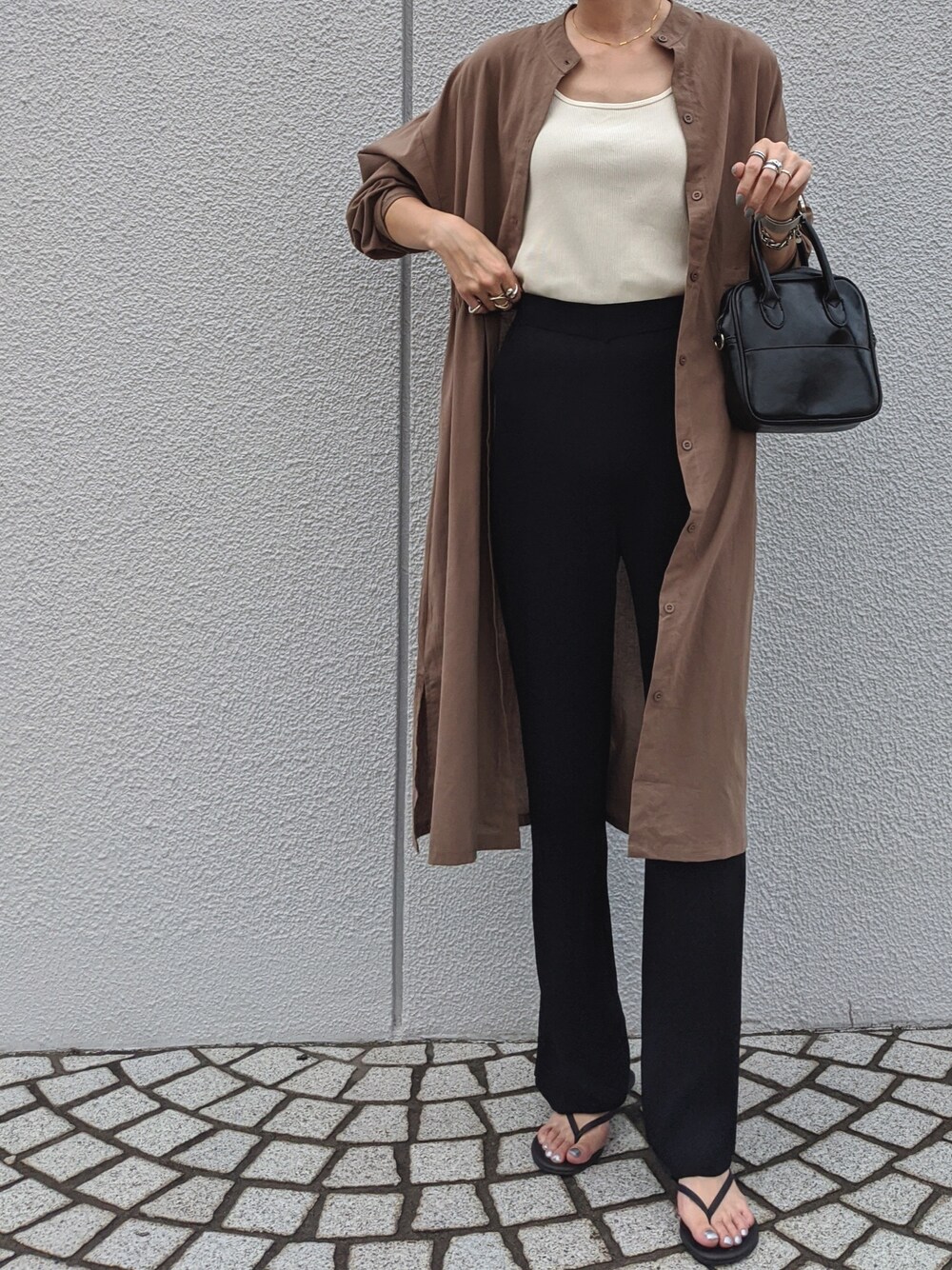 maichinのワンピース「ドロストデザインノーカラーシャツワンピース」を使ったコーディネート