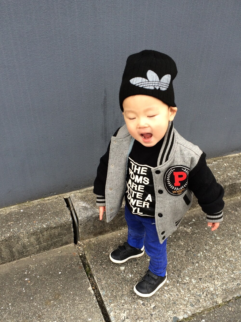 フリマで200円で買ったadidasのニット帽、大人用だから形が合わない(笑) たまに撮れる目つぶりショットを投稿。