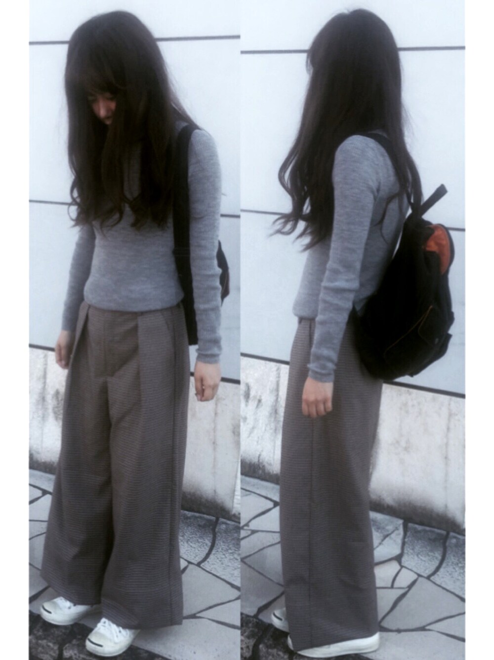 本日の通勤ファッション. タートルネック(無印) スニーカー(converse.JACK PURCELL) リュック(porter) #タートルネック #グレー #スニーカー #パンツ #リュック #リュック女子 #無印良品 #コンバース #converse #jackpurcell #ポーター #porter #巻き髪 #靴下屋