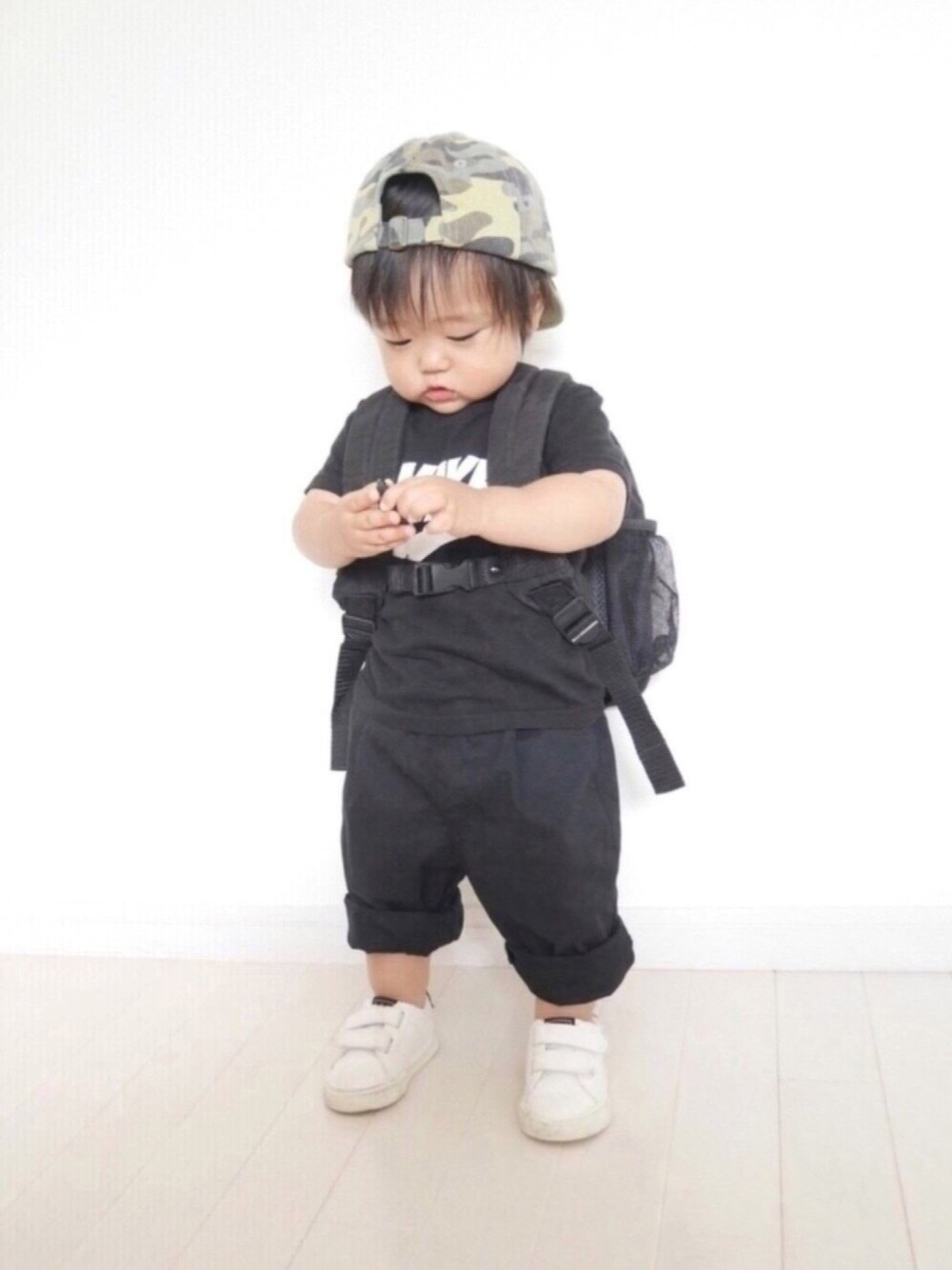 ブラック × 迷彩 ☺︎ この組み合わせすごく好きです ☺︎☺︎ ちなみに息子がいつも手に持っている 黒い物体はカメラのレンズキャップ。笑 キャップをレンズの所にカチッとはめるのが 楽しいみたいで、渡すと中々返してくれません 😂