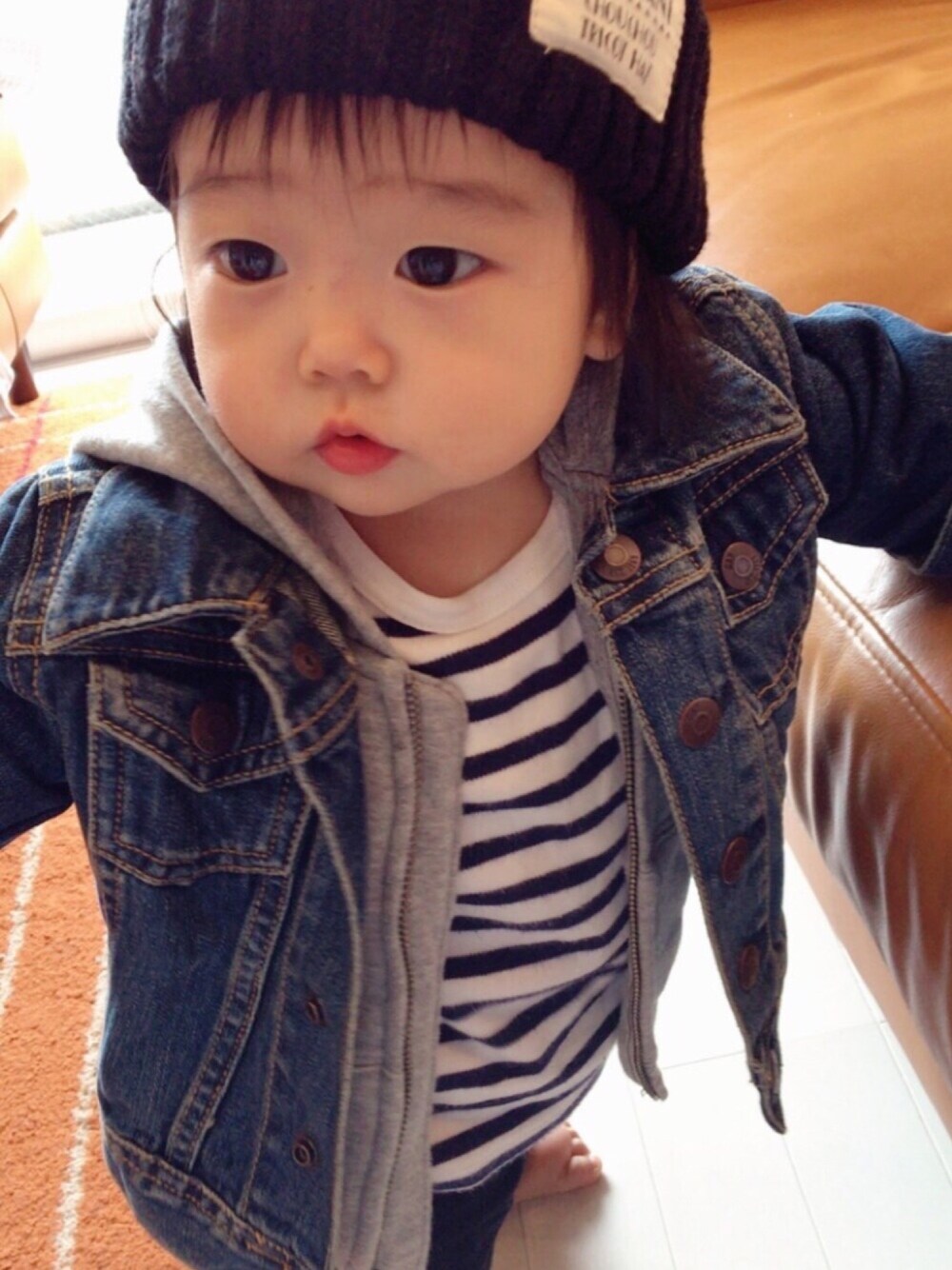 パーカー + Gジャン ☻ ほぼ見えないけど、パンツは黒スキニー ☻ ‥ 最近つたい歩きができるようになりました ( ´ω` )