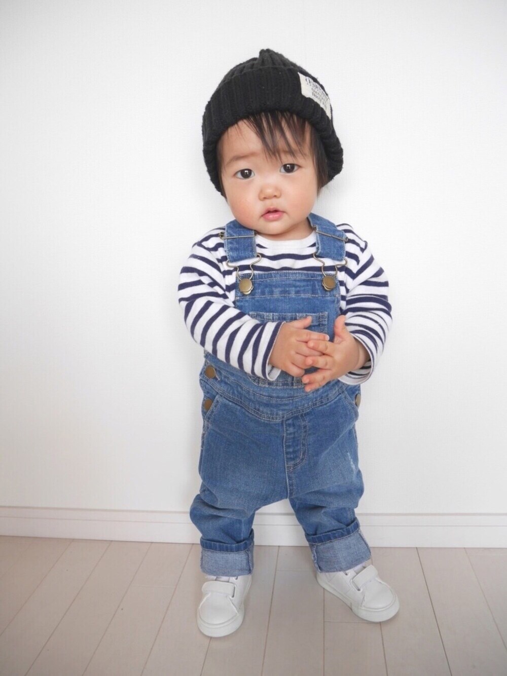 デニムサロペ ☻ ダボダボ感がいい感じ ☻ ちょっと短足みたいになってますが… 😂 . もうすぐ1歳になる息子 🤗 週末にじいじ、ばあば達を招いて お祝いをする予定なので楽しみです (^_^)