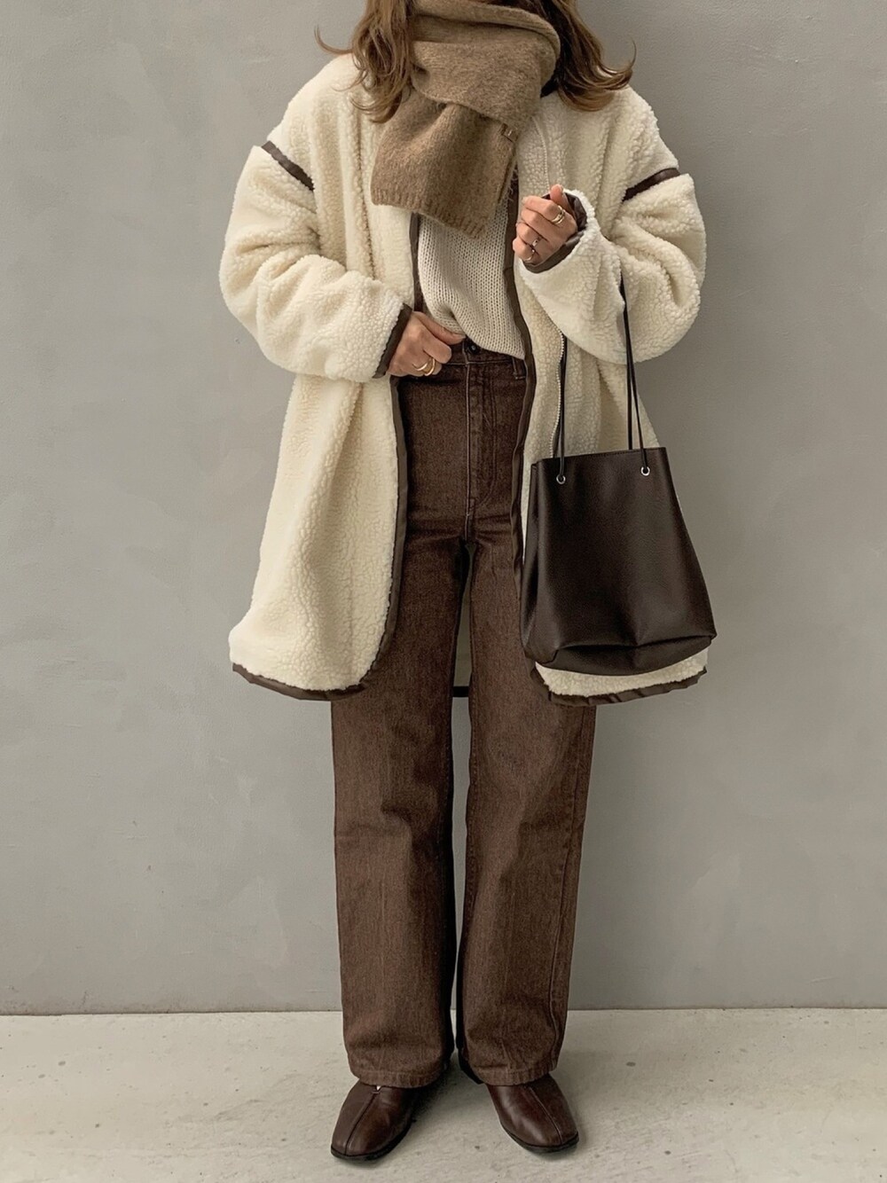 maamin♡のノーカラージャケット「【Fizz/フィズ】 レザー調パイピング ジップアップ ノーカラーロングボアコート」を使ったコーディネート