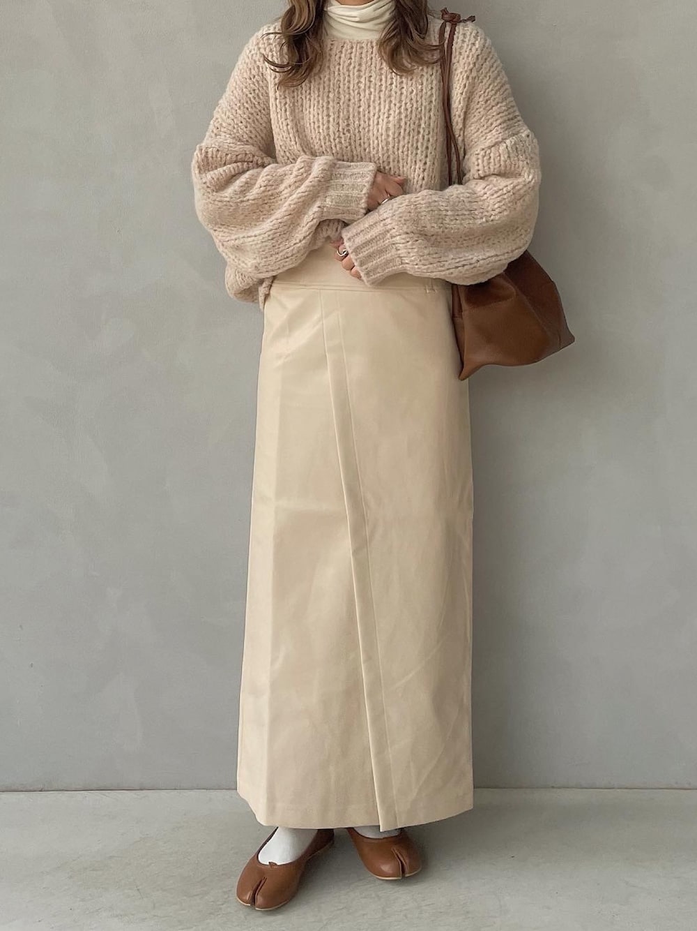 .. ミルクティーカラーコーデ🫖🤍 レザースカートはスリットデザインがポイント🐕 お気に入りのニットとタートル合わせてみた♡
