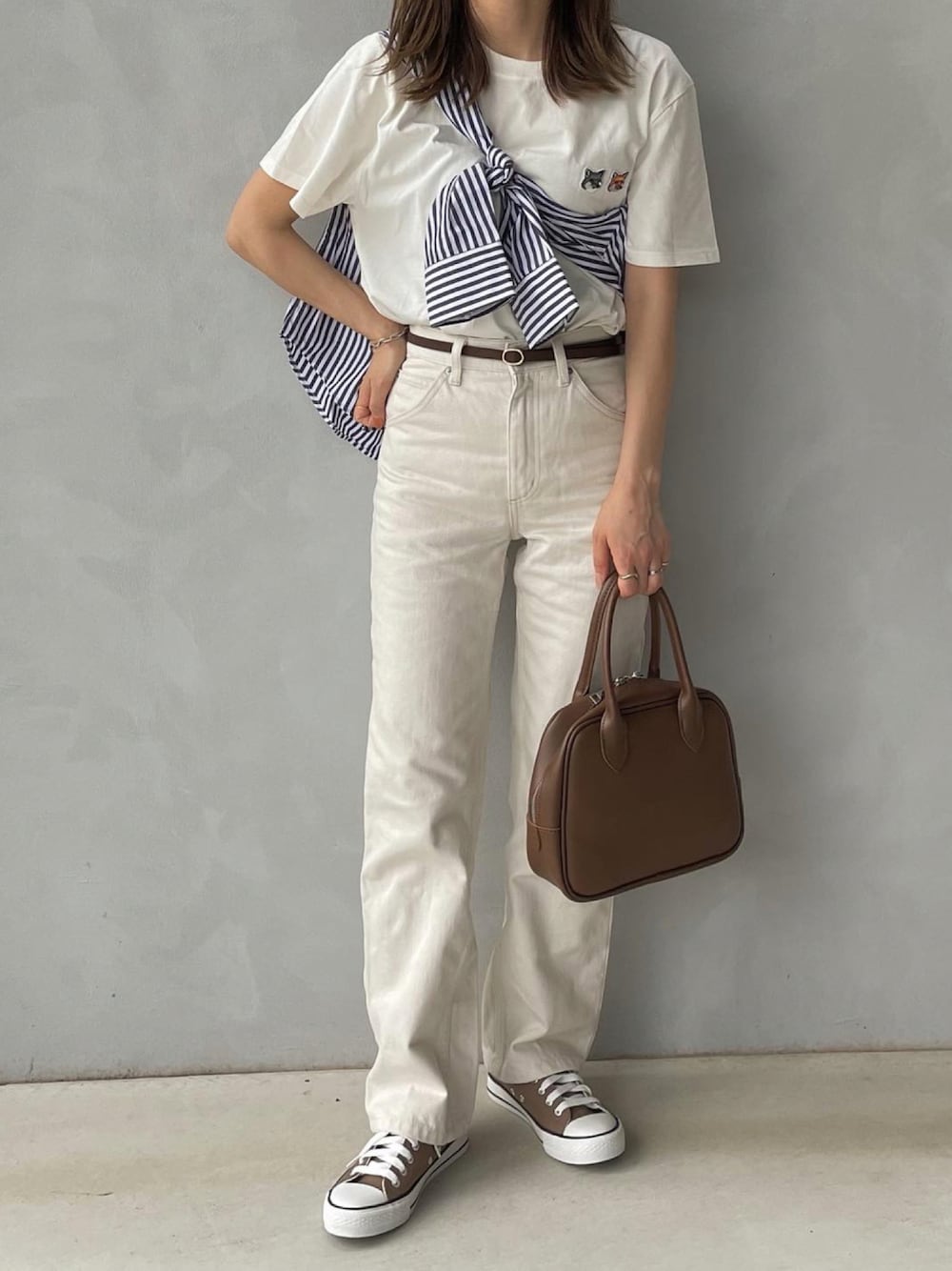 🦊とホワイトデニムコーデ シンプルで使いやすいスニーカーは ブラウンの色味もよきです◎