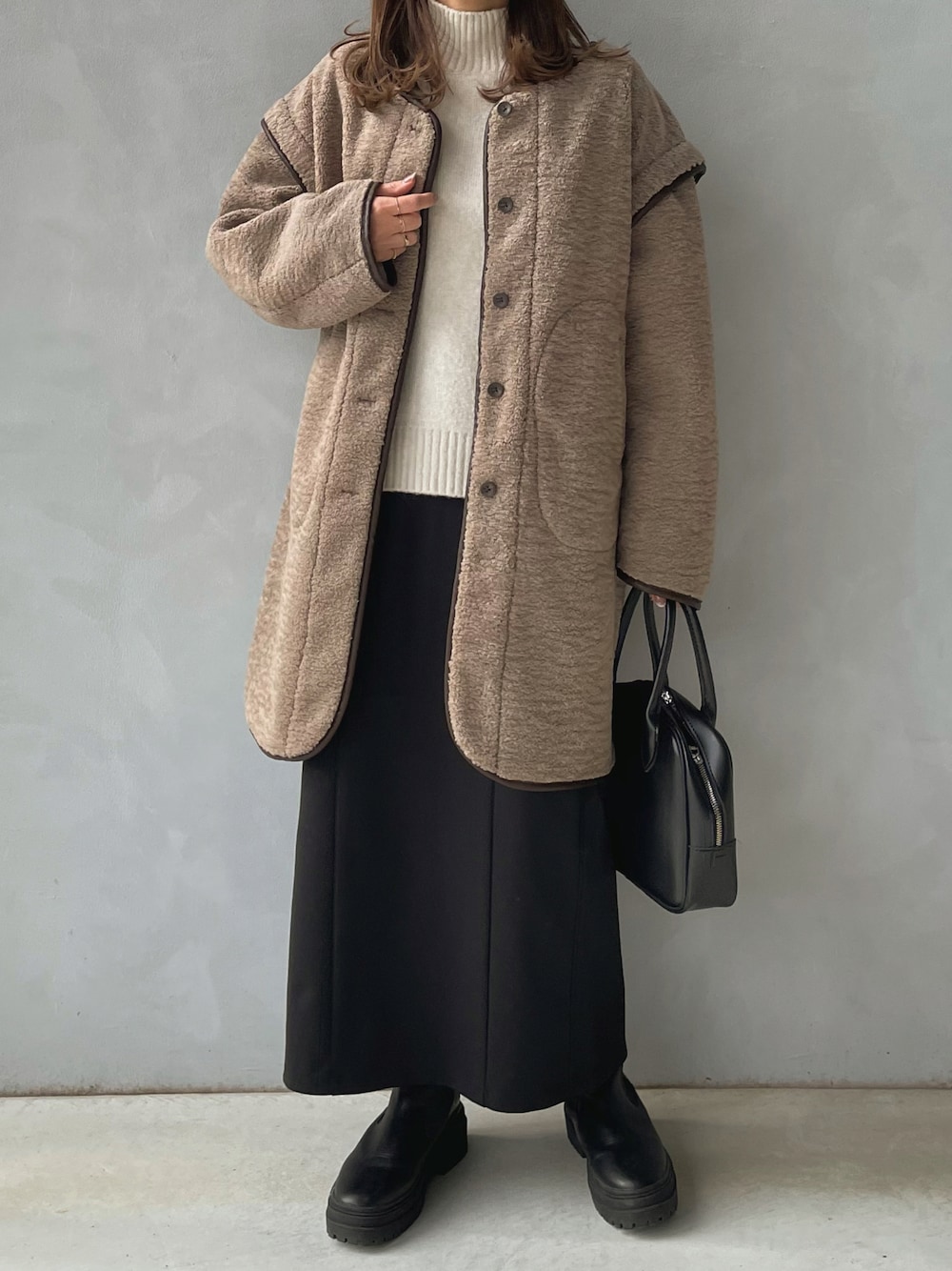 maamin♡のムートンコート「WEB限定 フェイクムートン/パイピングボアコクーンコート」を使ったコーディネート