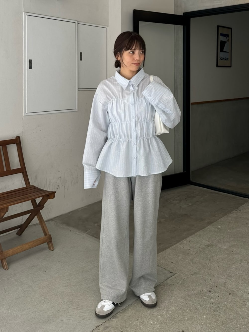 春になったらブラウス着たくなる︎~ ⠀ シャーリングデザインが今っぽで可愛すぎる♡! 甘くなりすぎんようにスウェットパンツ合わせがポイント(^_−)−☆ ⠀