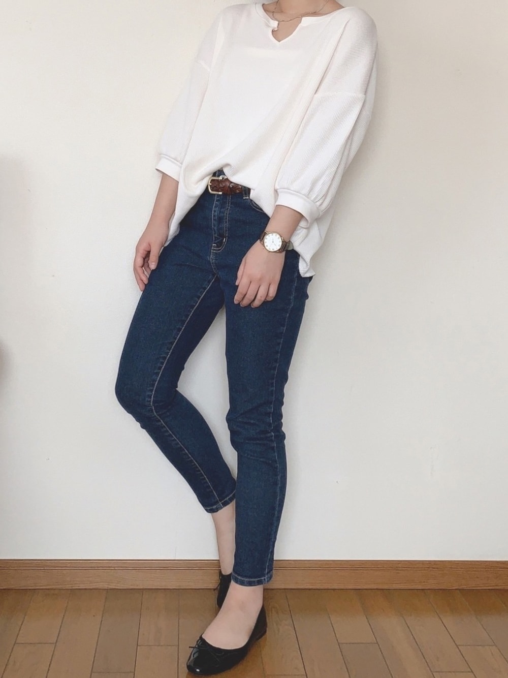 シンプルコーデ☆ おはようございます 見にきていただきありがとうございます☺︎ シンプルなコーデに小物のちょい足しでこなれ感出してみました‼︎(←出せてると良いなぁー笑)