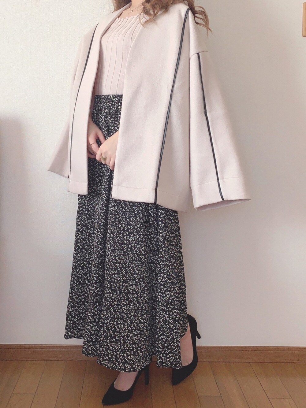 おはようございます 見にきていただきありがとうございます☺︎ 気分は春って事で春先取りコーデ🌸 靴、アクセサリー以外全てGRL‼︎ 薄手のニットに花柄のスカート可愛い♡